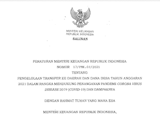Kementerian Keuangan menerbitkan Peraturan Menteri Keuangan Republik Indonesia Nomor 17/PMK.O7/2O21 tentang Pengelolaan Transfer Ke Daerah dan Dana Desa Tahun Anggaran 2O21 Dalam Rangka Mendukung Penanganan Pandemi Corona Virus Disease 2O19 (COVID-19) dan Dampaknya. Permenkeu 17/PMK.O7/2O21 tentang Pengelolaan TKDD 2O21 dalam rangka Penanganan Pandemi COVID-19 dan Dampaknya ini untuk melaksanakan ketentuan Pasal 6 ayat (2) huruf a juncto Pasal 8 Undang-Undang Nomor 17 Tahun 2OO3 tentang Keuangan Negara, yang menyatakan bahwa pengelolaan Keuangan Negara dikuasakan kepada Menteri Keuangan selaku pengelola fiskal.