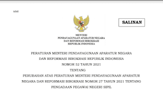 Peraturan menteri pendayagunaan aparatur negara dan reformasi birokrasi republik indonesia Nomor 52 Tahun 2021 Tentang Perubahan Atas Peraturan Menteri Pendayagunaan Aparatur Negara Dan Reformasi Birokrasi Nomor 15 Tahun 2021 Tentang Pengadaan Pegawai Negeri Sipil Ditetapkan di Jakarta pada tanggal 12 Oktober 2021 oleh menteri pendayagunaan aparatur Negara dan reformasi birokrasi republik indonesia, Tjahjo Kumolo. Selanjutnya Diundangkan di Jakarta pada tanggal 21 Oktober 2021 oleh direktur jenderal Peraturan perundang-undangan Kementerian Hukum Dan Hak Asasi Manusia Republik Indonesia, Benny Riyanto kemudian dimasukkan Dalam Berita Negara Republik Indonesia Tahun 2021 Nomor 1182.